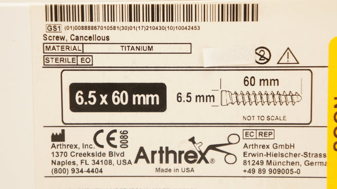 - Arthrex AR-13280-60 Titanium Screw Cancellous 6.5 mm x 60 mm (x)
