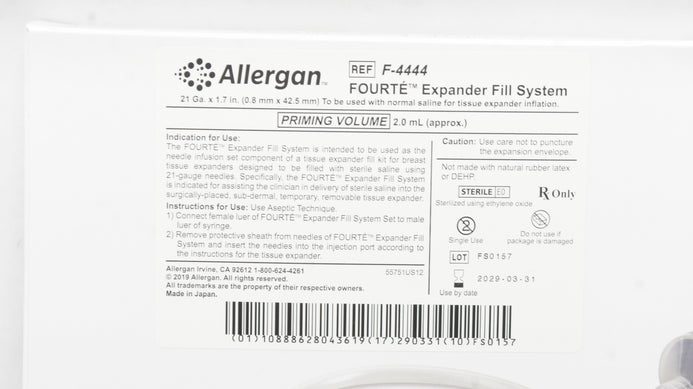 - Allergan F-4444 Fourte Expander Fill System 21 Ga x 1.7inch Priming Vol. 2.0mL