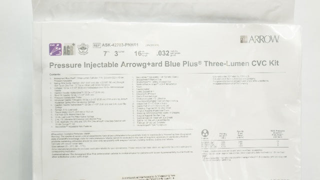 - Arrow ASK-42703-PNHS1 Pressure Injectable 3-Lumen CVC Kit 7Fr x16cmx.032inch (x)