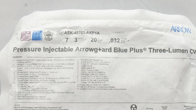 - Arrow ASK-45703-AKP1A Pressure Injectable Three-Lumen CVC 7Fr x 20cm x .032in(x)