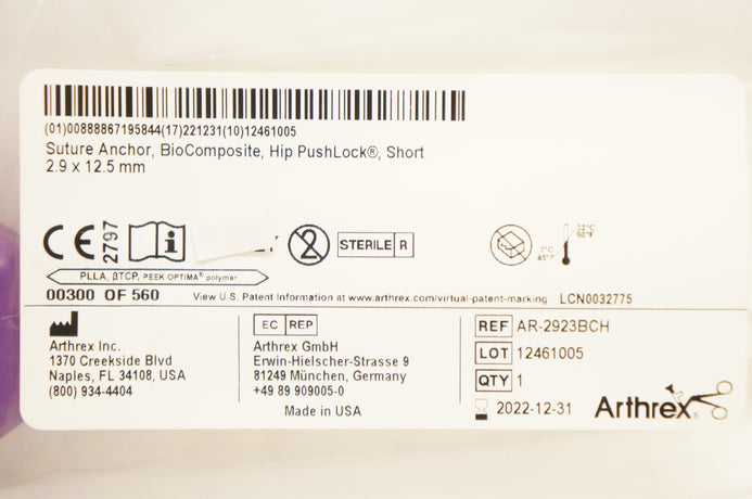 - Arthrex AR-2923BCH Suture Anchor BioComposite Hip PushLock Short 2.9 x 12.5mm