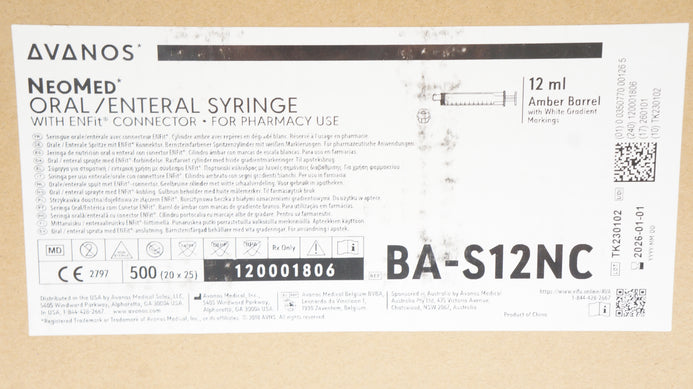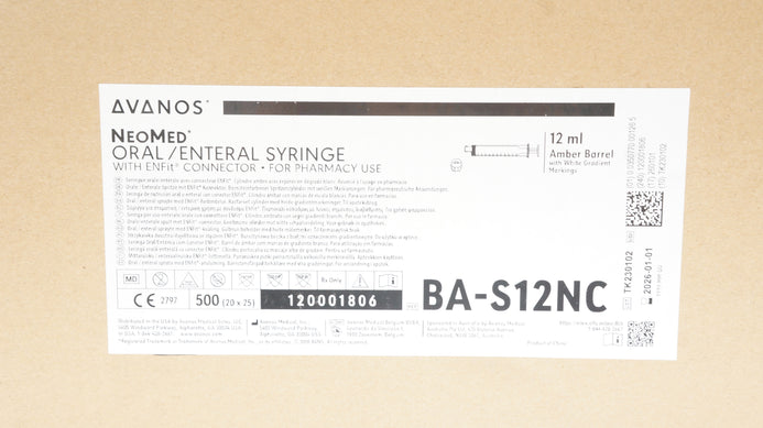 - Avanos BA-S12NC-S Neomed Oral/Enteral Syringe w/ENFit Connector 12ml- Box of 500
