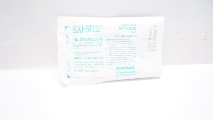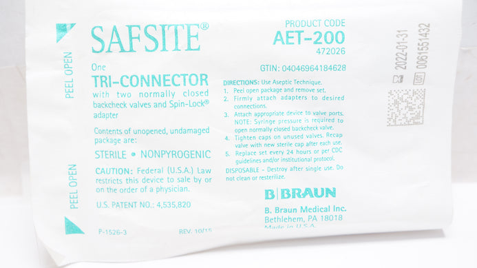 - B.Braun 472026 AET-200 SAFSITE Tri-Connector w/ 2 Valves & Spin-Lock Adapter (x)