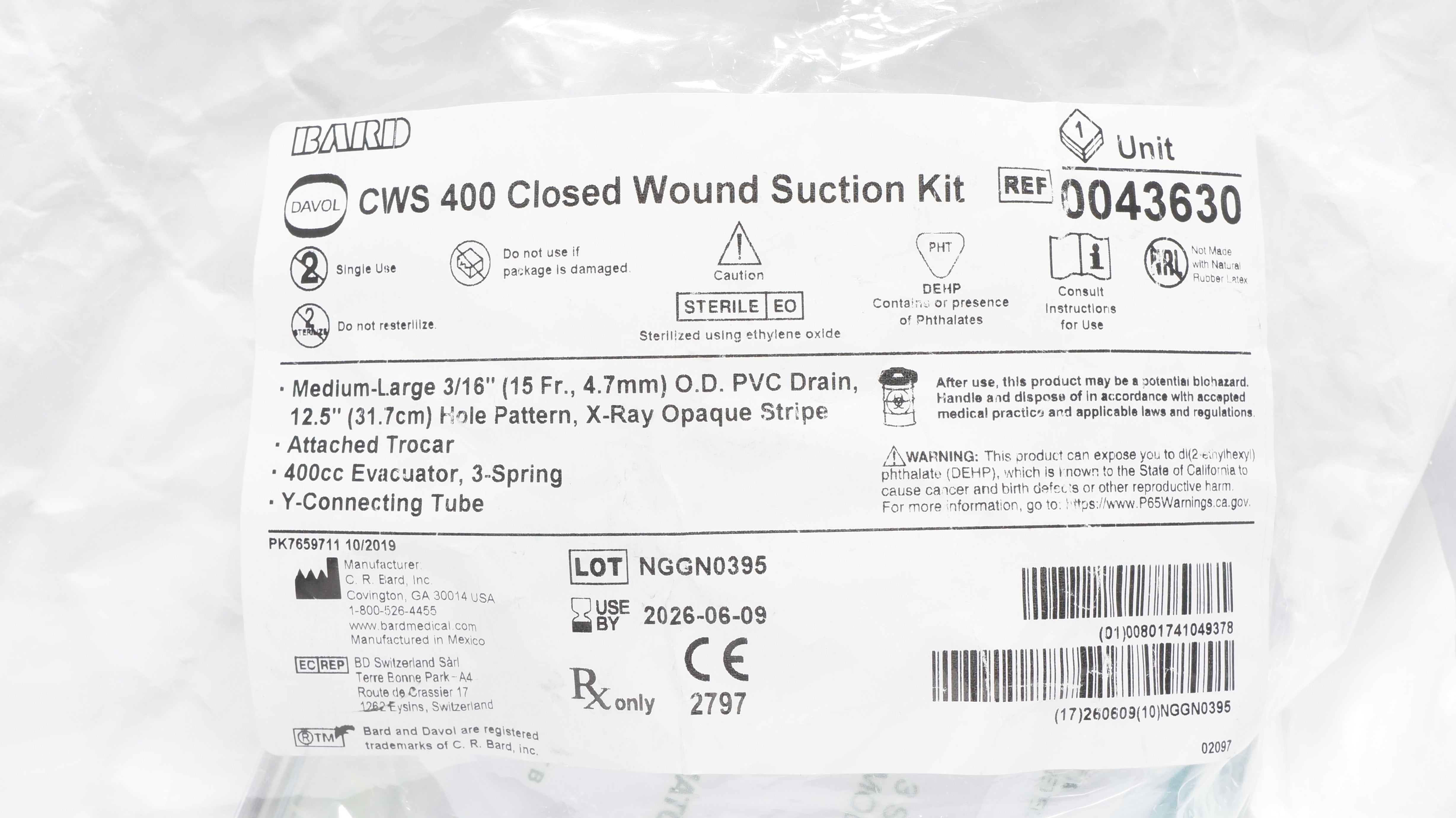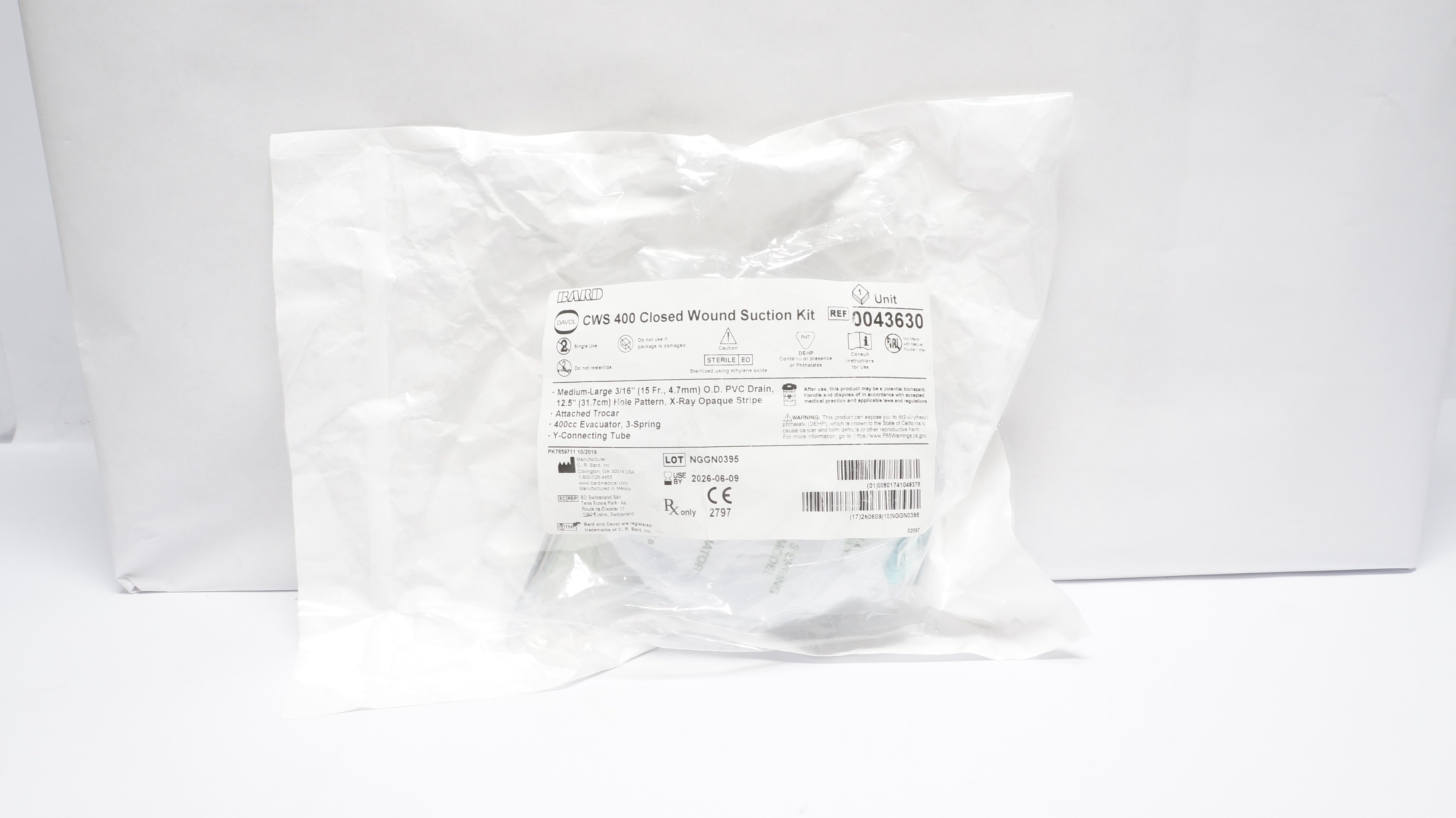 - Bard 0043630 Davol CWS 400 Closed Wound Suction Kit 3/16inch x 12.5inch
