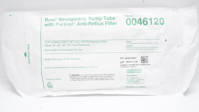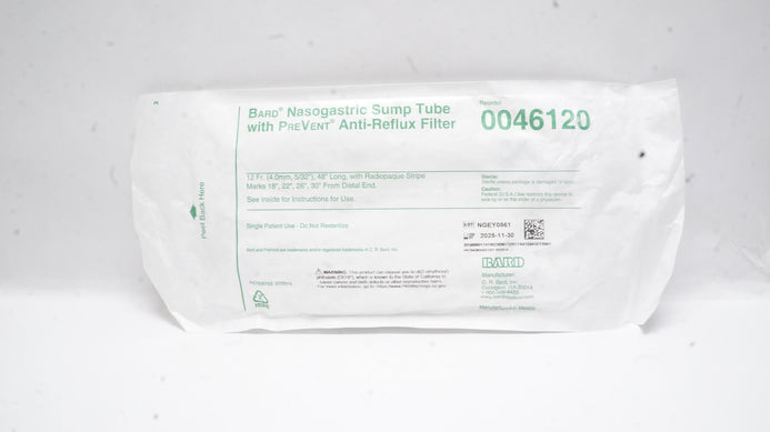 - Bard 0046120 Nasogastric Sump Tube with PreVent Anti-Reflux Filter 12Fr x 48inch