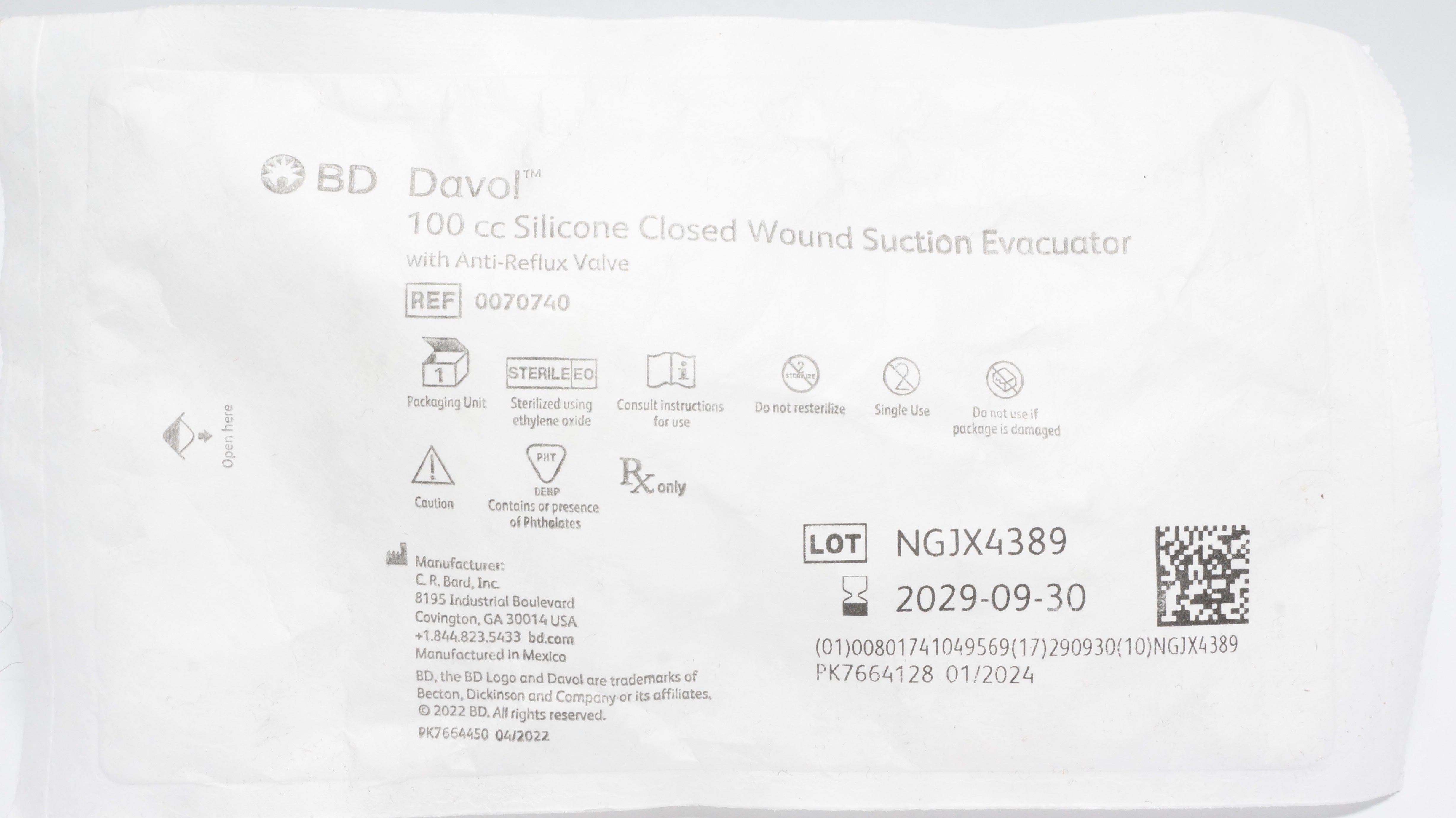 - Bard 0070740 Davol Silicone Closed Wound Suction Evacuator 100cc
