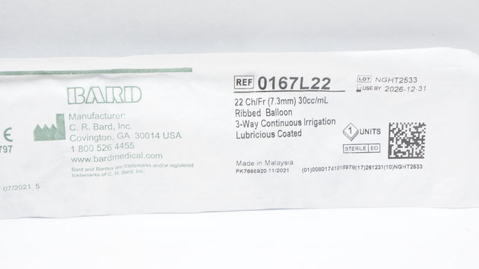 - Bard 0167L22 Bardex Foley Cath. 22Fr 30cc/mL Ribbed Balloon, 3-Way Irrigation