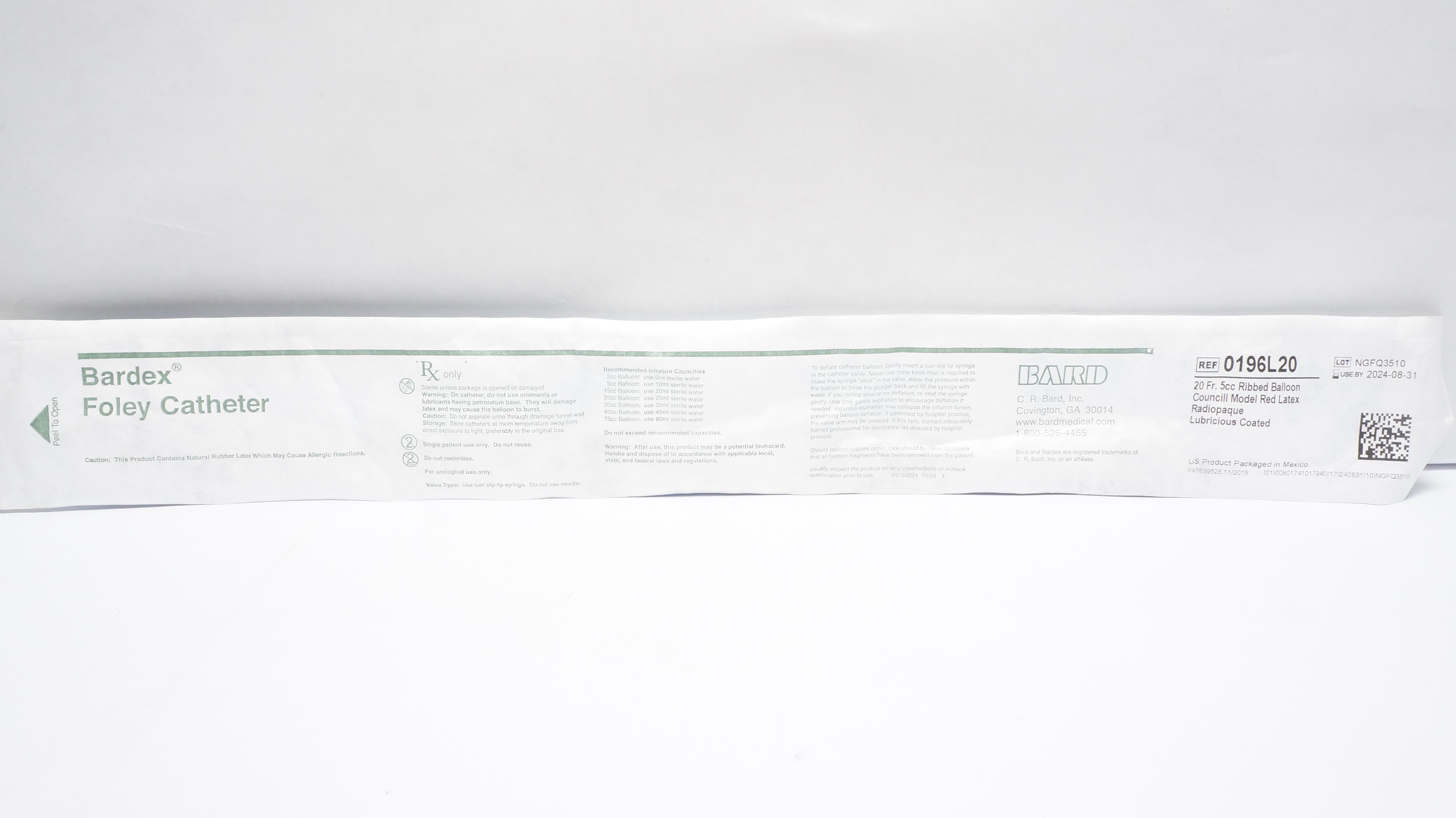 - Bard 0196L20 Bardex Foley Cath. 20Fr. 5cc Ribbed Balloon, Councill Model (x)