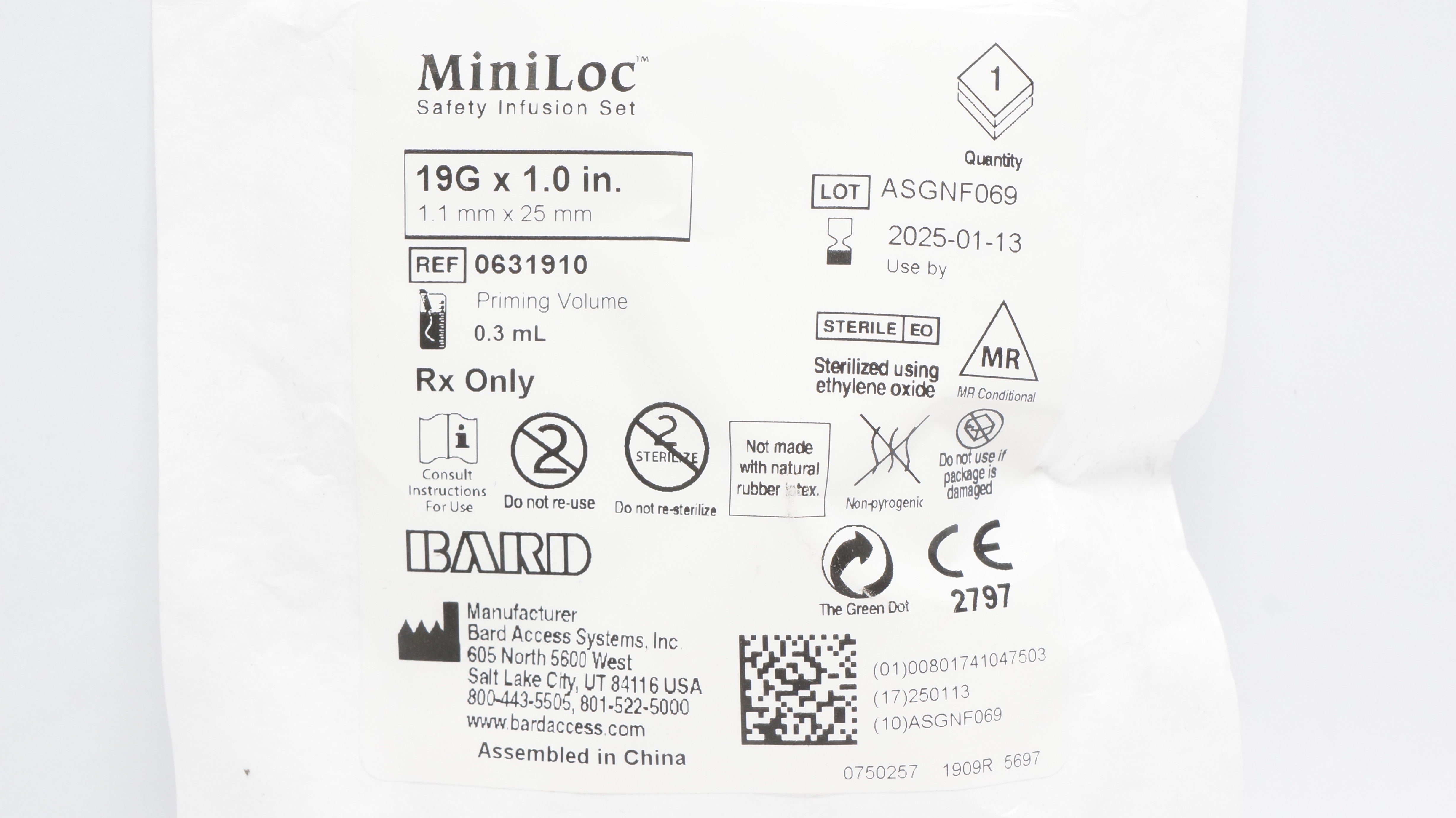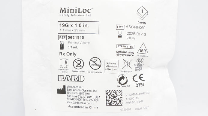 - Bard 0631910 Miniloc Safety Infusion Set 19G x 1.0inch Priming Volume 0.3mL (x)