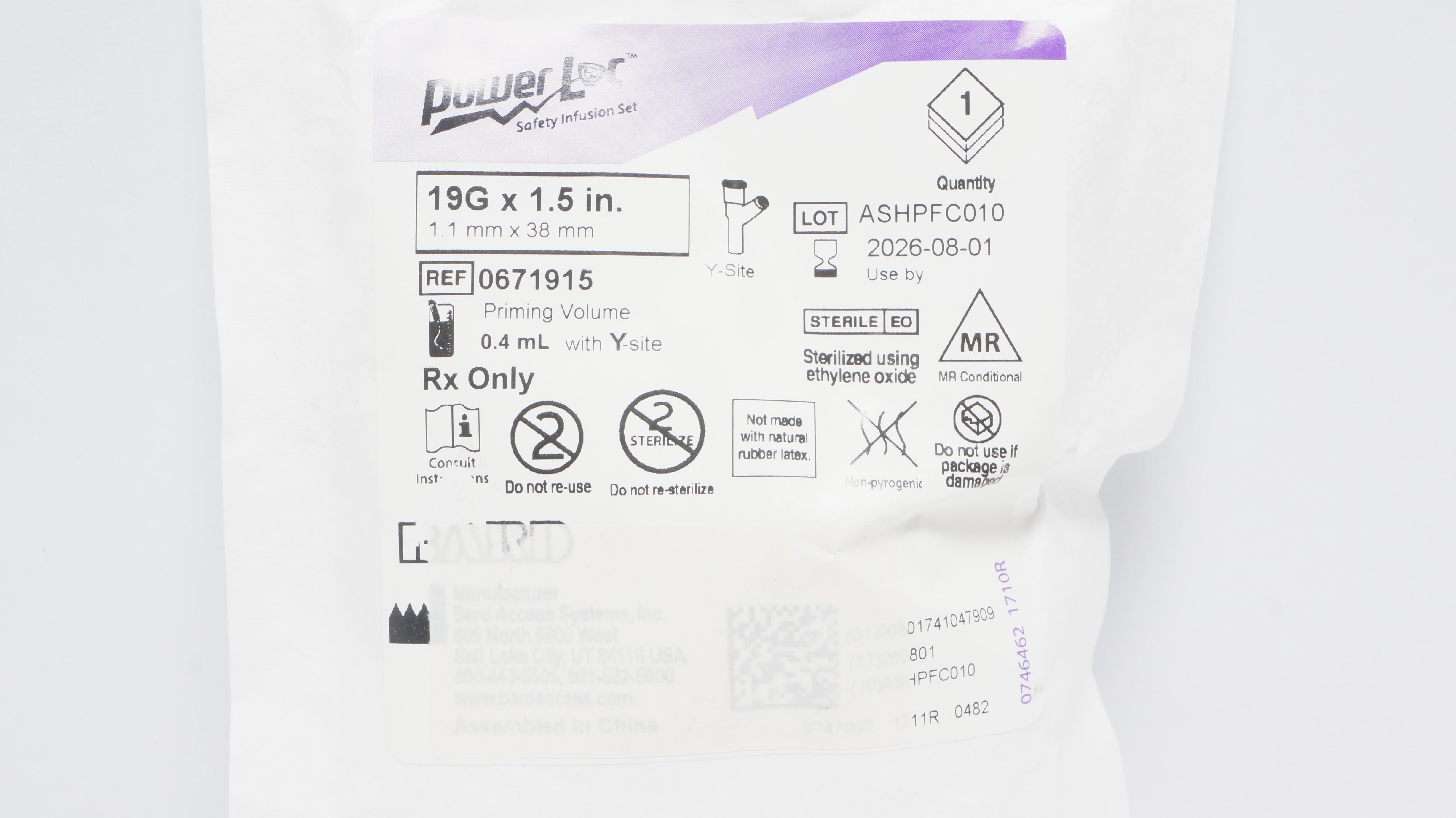- Bard 0671915 PowerLoc Safety Infusion Set 19G x 1.5In 0.4ml W/ Y-Site