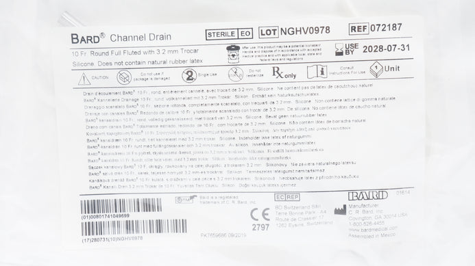- Bard 072187 Channel Drain 10 Fr. Round Full Fluted With 3.2mm Trocar Silicone