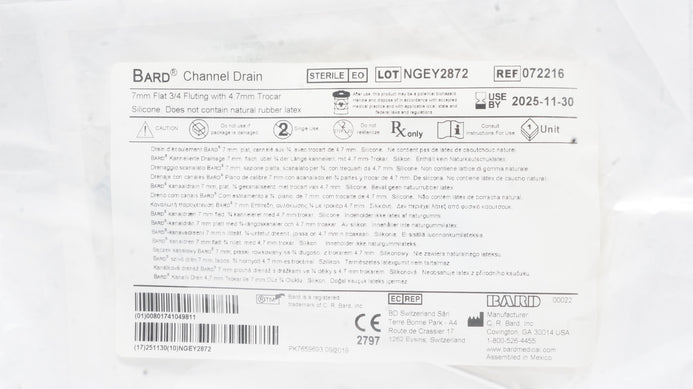 - Bard 072216 Silicone Channel Drain 7F Flat, 3/4 Fluting with 4.7mm Trocar