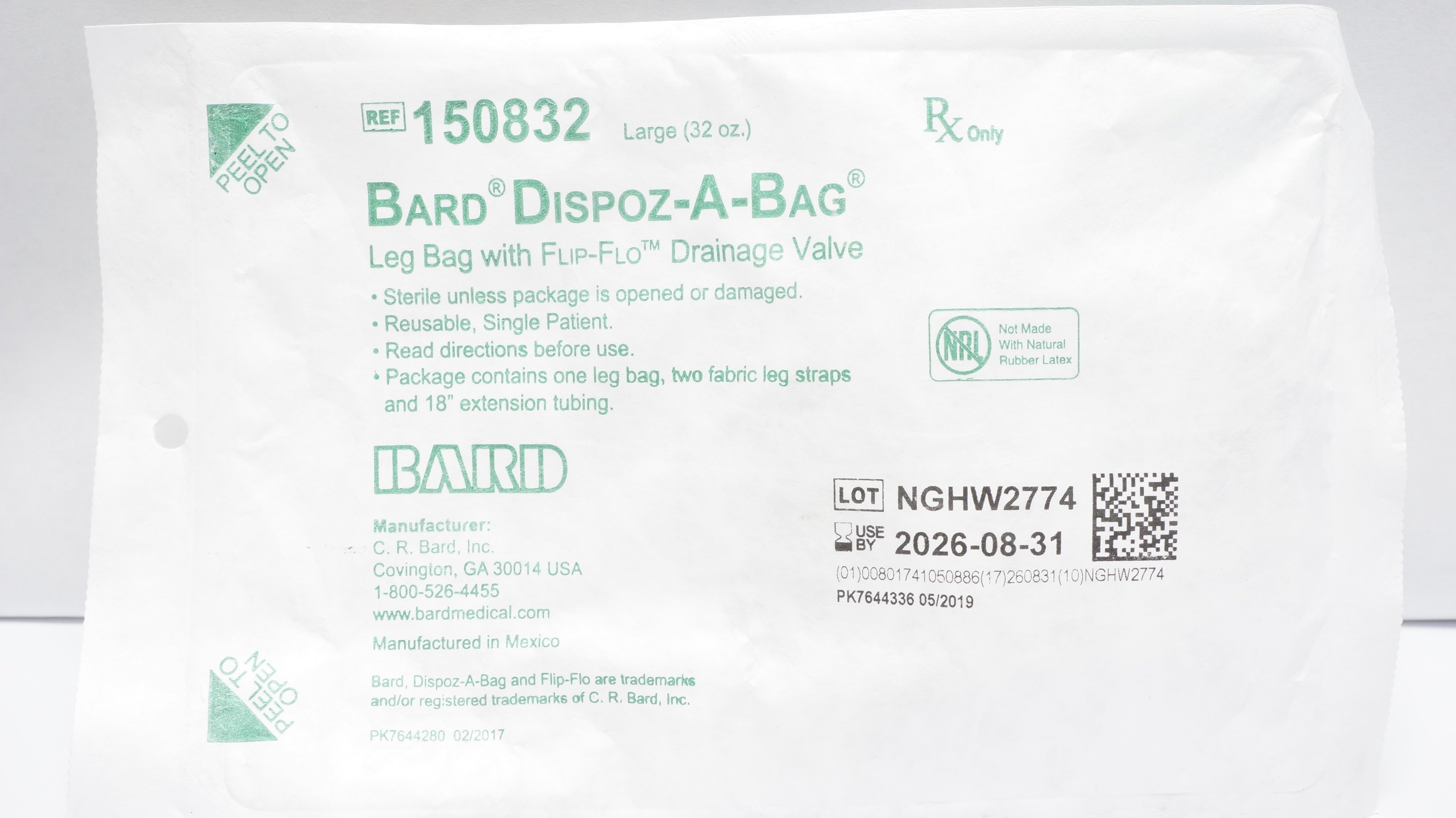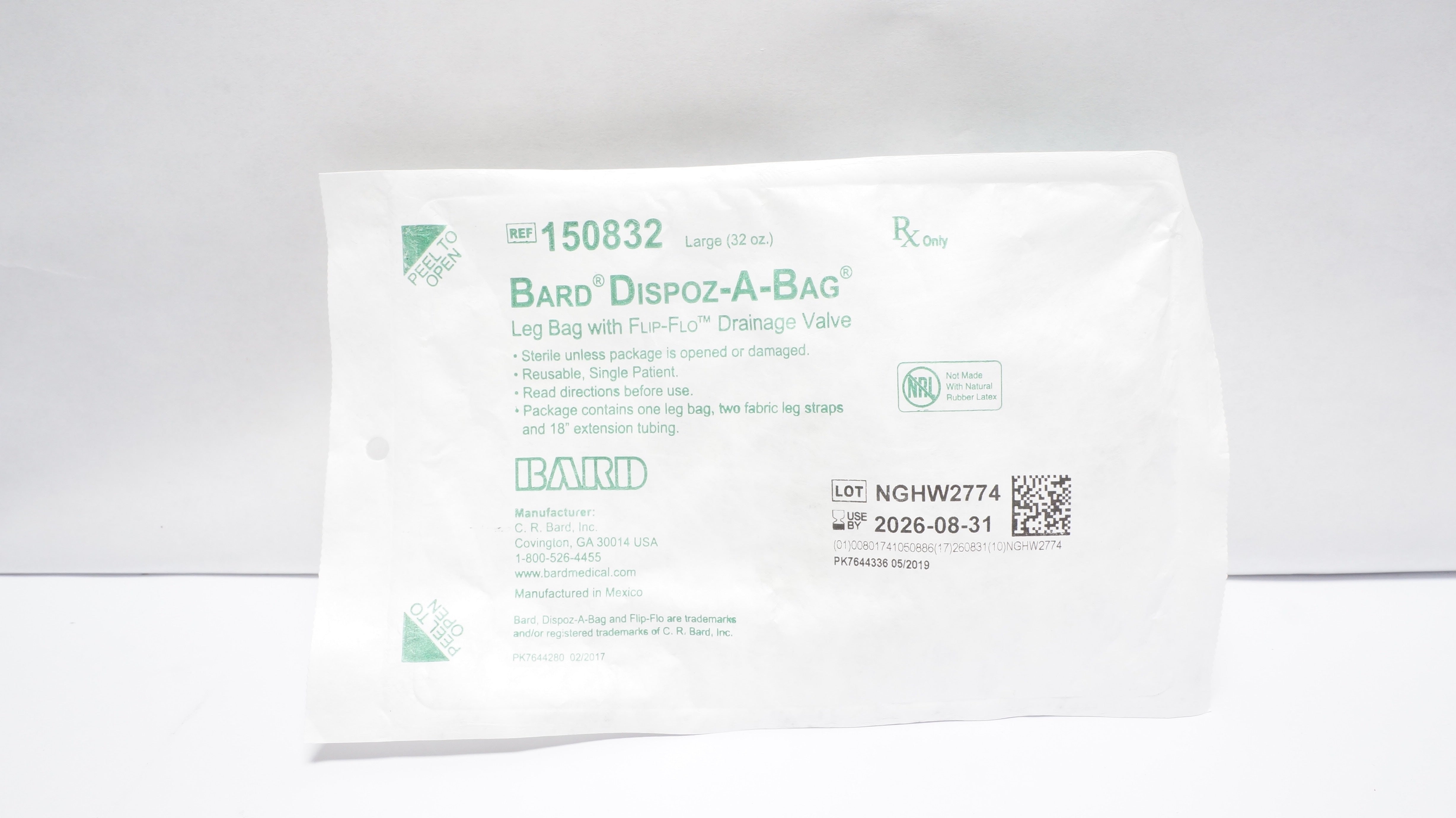 - Bard 150832 Latex-Free Dispoz-A-Bag Leg Bag w/ Flip-Flo Drainage Valve