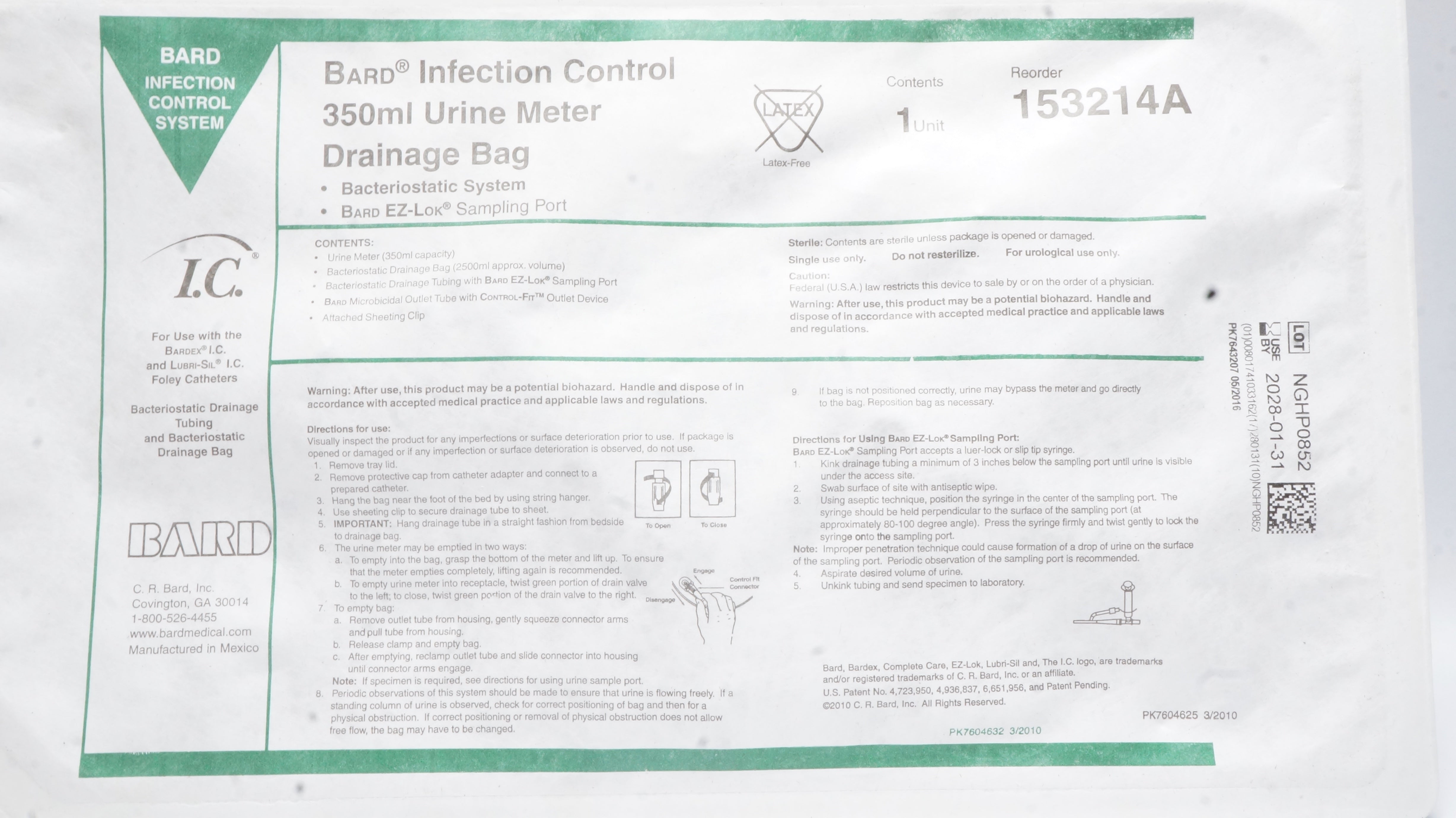 - Bard 153214A Infection Control 350 ml Urine Meter Drainage Bag
