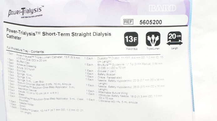 Bard 5605200 Power-Trialysis Short-Term Straight Dialysis Cath. Tray 13F x 20cm