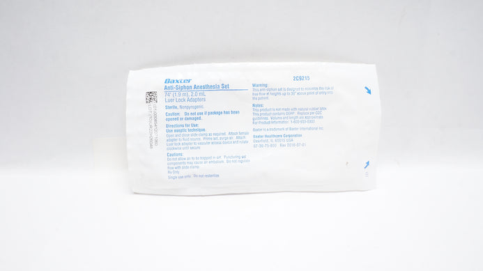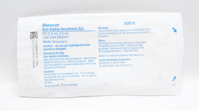 - Baxter 2C9215 Anti-Siphon Anesthesia Set 74inch x 2.0mL Luer Lock Adapters