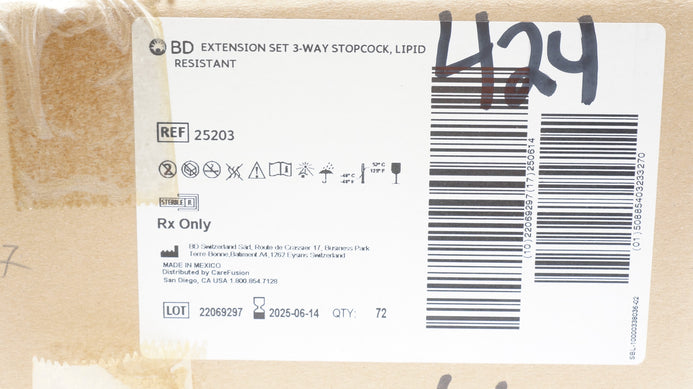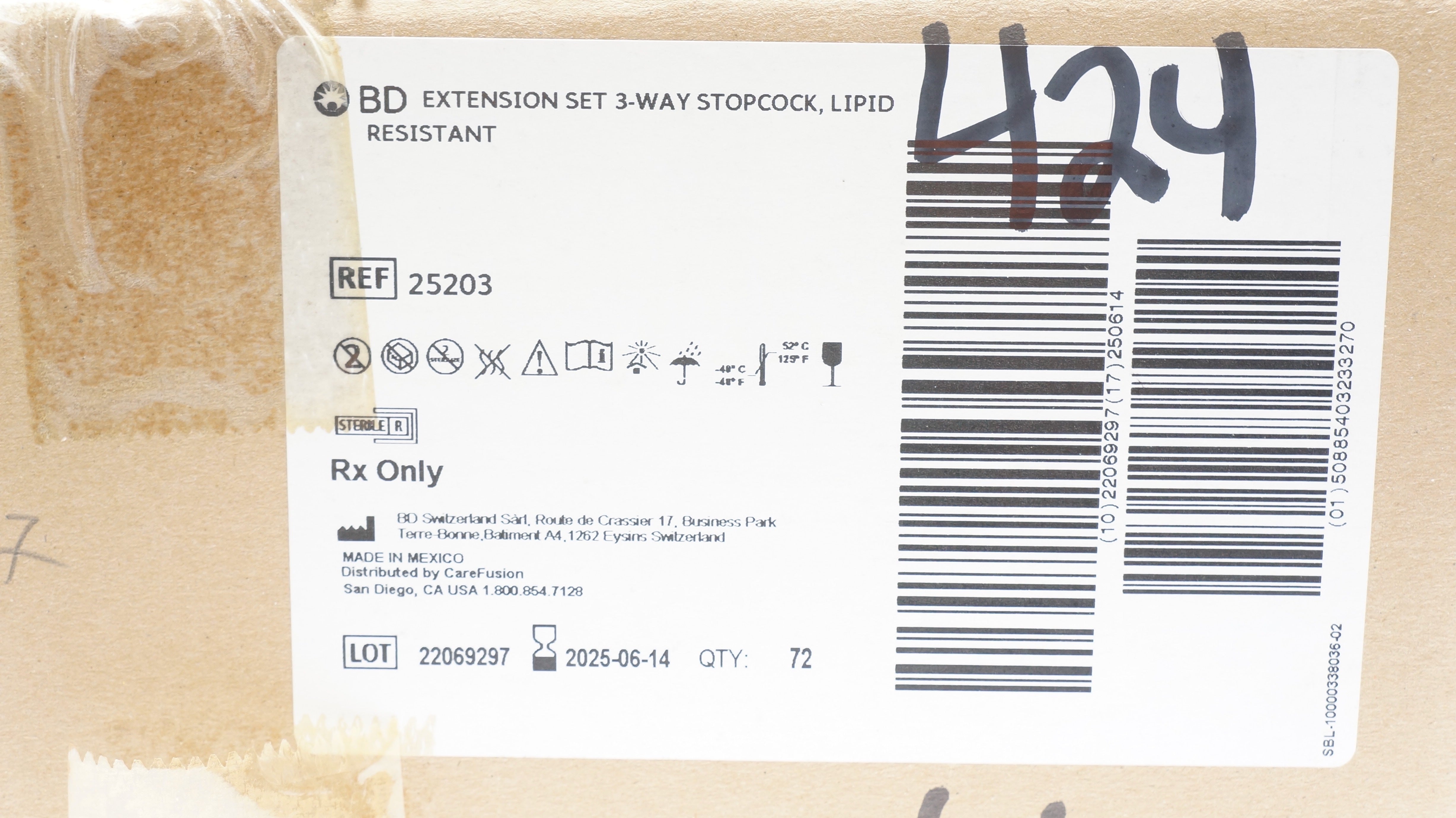 - BD 25203 Alaris Extension Set 3-Way Stopcock, Lipid Resistant - Box of 72