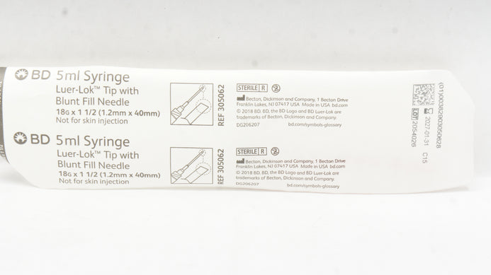 - BD 305062 Syringe Luer-Lock Tip 5ml with Blunt Fill Ndle 18G x 1 1/2inch