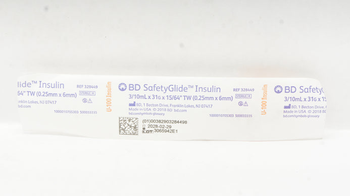 - BD 328449 SafetyGlide Insulin Syringe 3/10ml x 31G x 15/64in TW