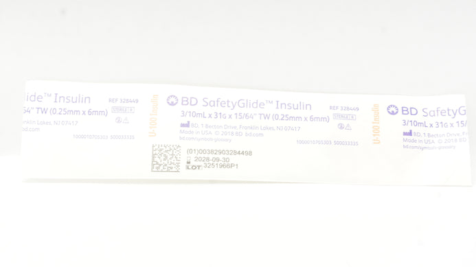 - BD 328449 SafetyGlide Insulin Syringe 3/10ml x 31G x 15/64inch TW