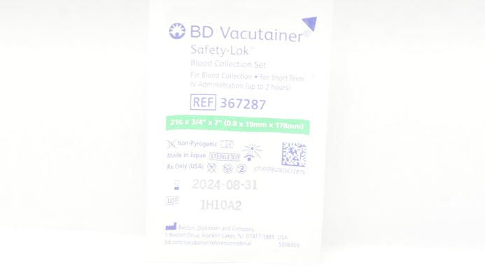 BD 367341 Vacutainer Push Button Blood Collection Set 25G x 3/4inch x 12inch BD 367287 Vacutainer Safety-Lok Blood Collection Set 21G x 3/4inch x 7inch BD 367287 Vacutainer Safety-Lok Blood Collection Set 21G x 3/4inch x 7inch