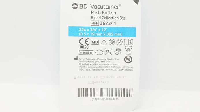 - BD 367341 Vacutainer Push Button Blood Collection Set 25G x 3/4inch x 12inch