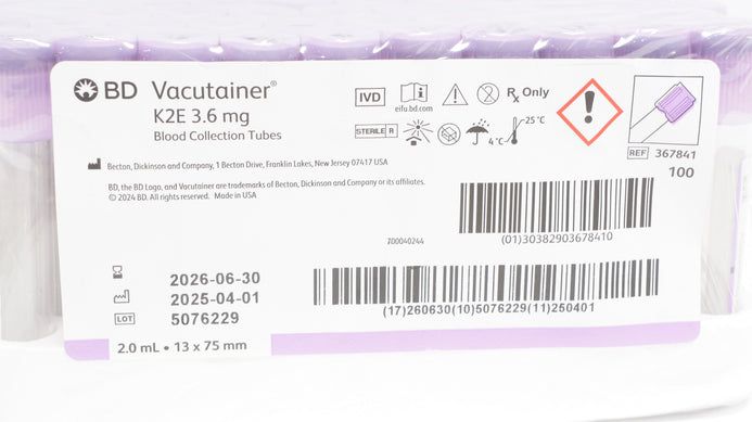 - BD 367841 Vacutainer K2 EDTA 3.6mg Blood Collection Tubes 2ml 13x75mm-Box of 100