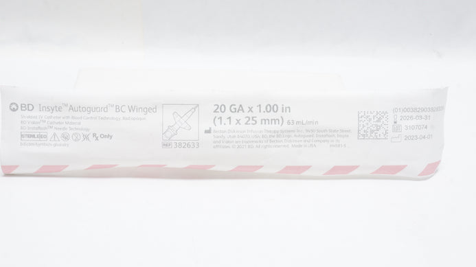 - BD 382633 Insyte Autoguard BC Winged Shielded IV Cath. 20GA x 1.00inch 63ml/min