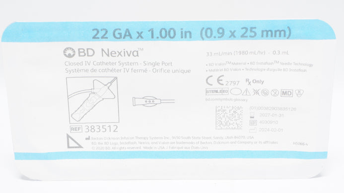- BD 383512 Nexiva Clodsed IV Cath. System 22GA x 1.00inch 33mL/min