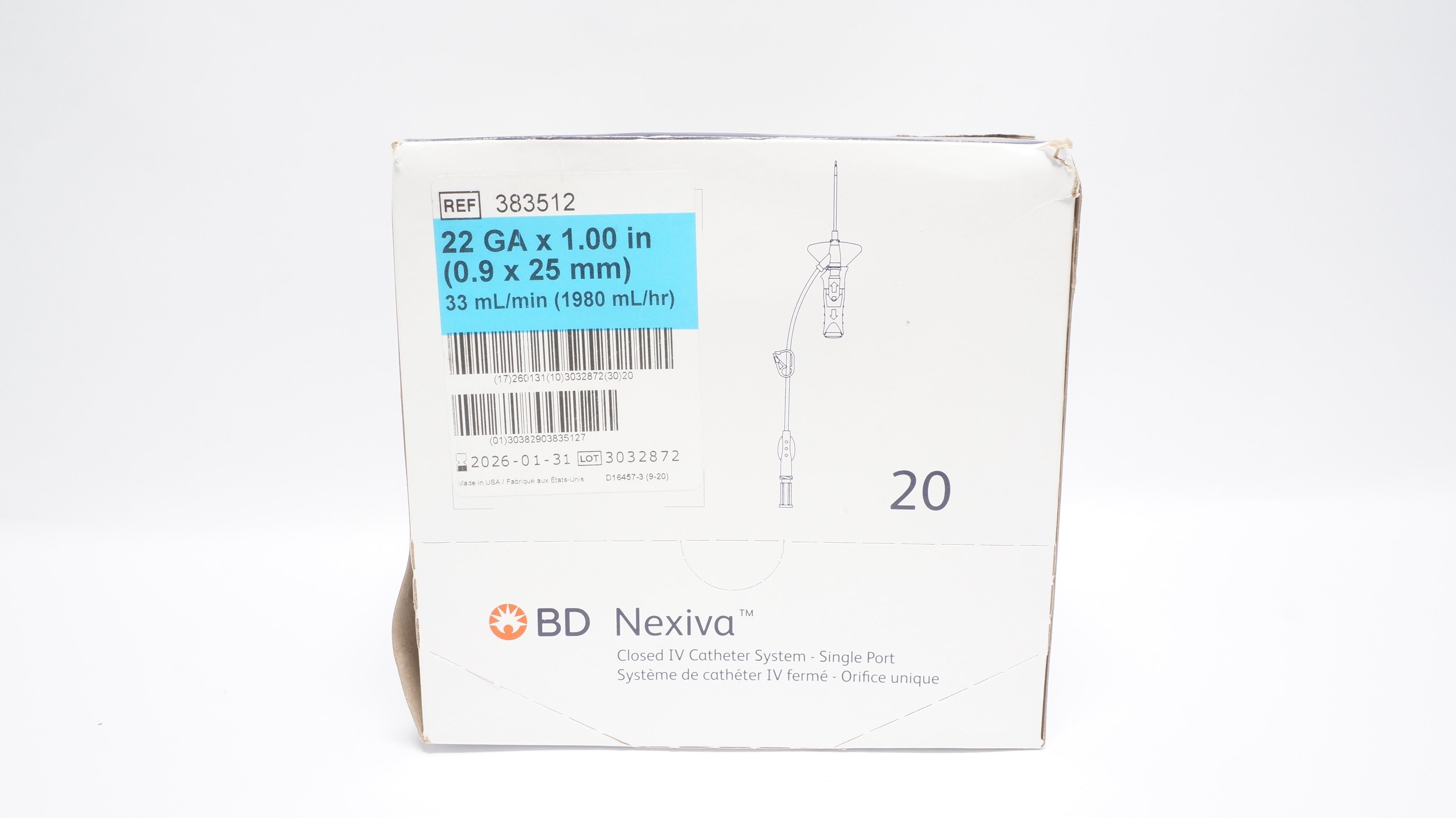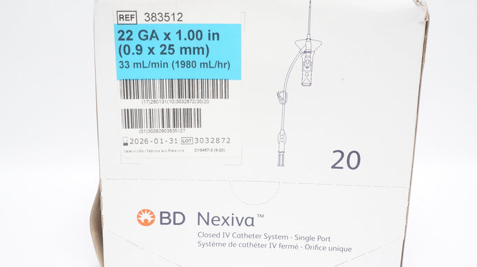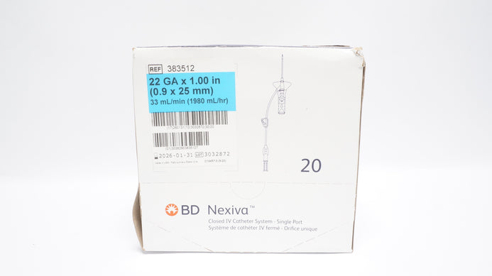 - BD 383512 Nexiva Clodsed IV Cath. System 22GA x 1.00inch 33mL/min - Box of 20