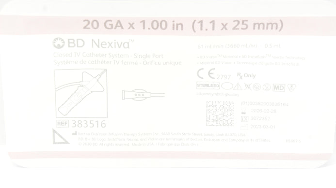- BD 383516 Nexiva Clodsed IV Cath. System-Single Port 20GA x 1.00inch 61mL/min