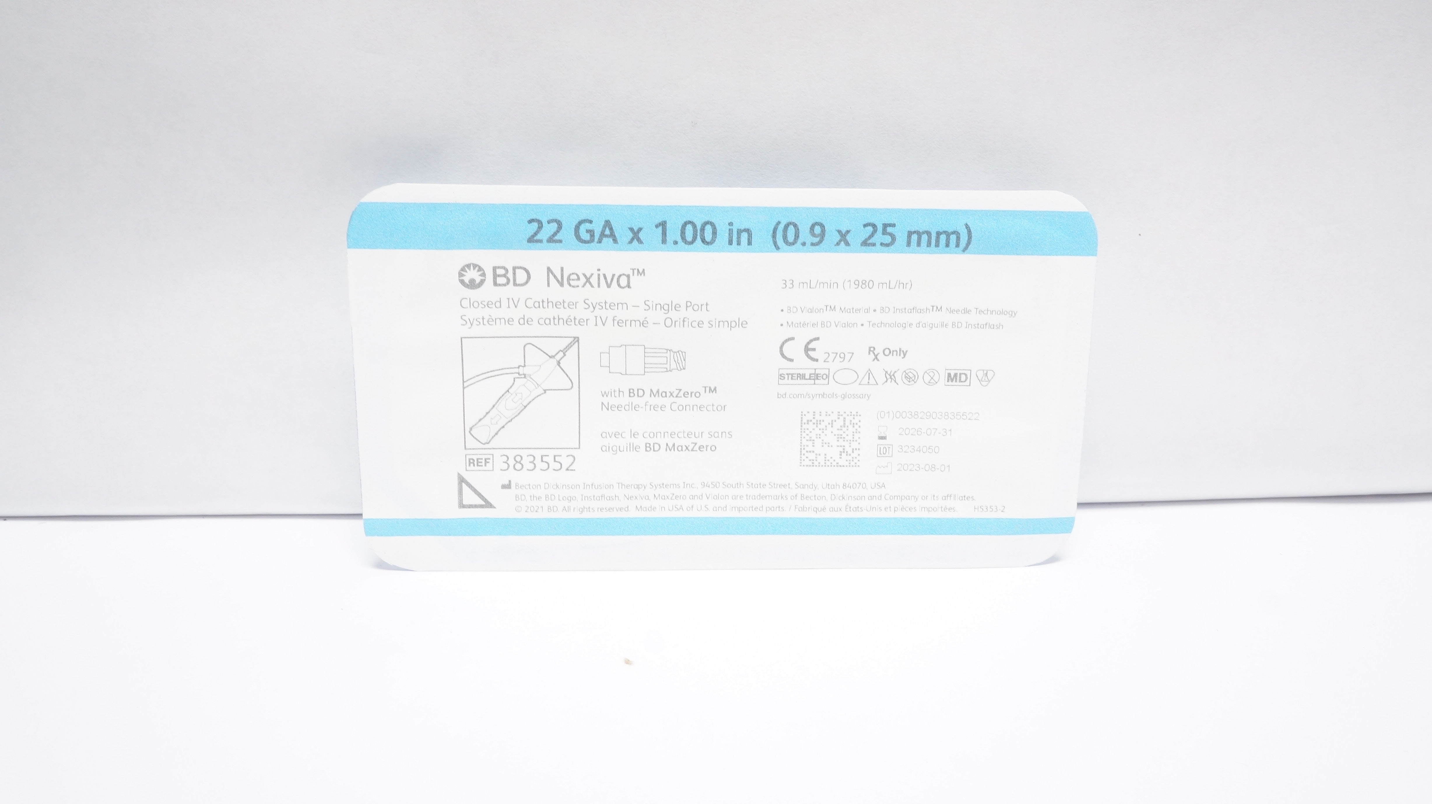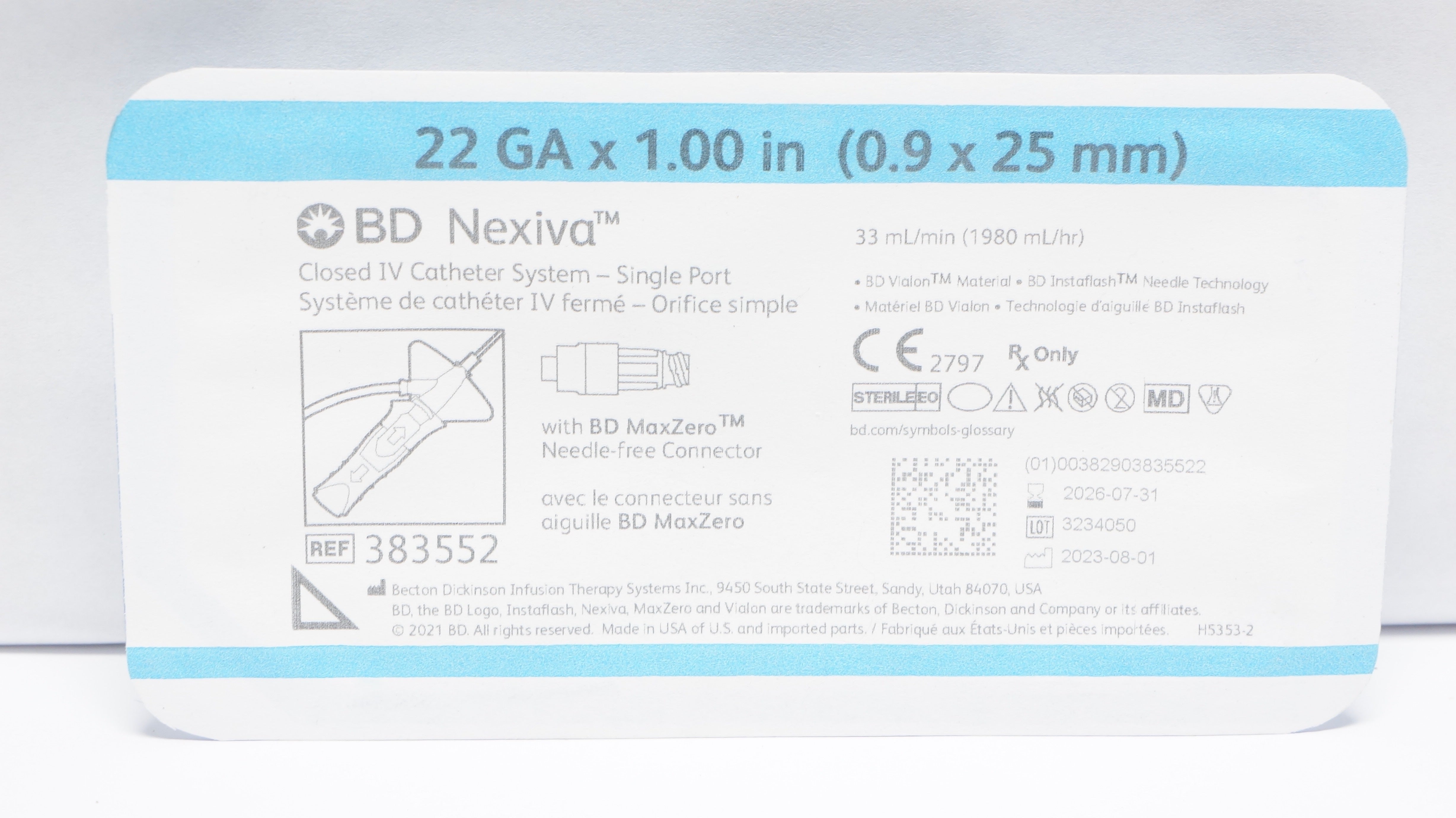 - BD 383552 Nexiva Closed IV Cath. System 22Ga x 1.00inch 33mL/min