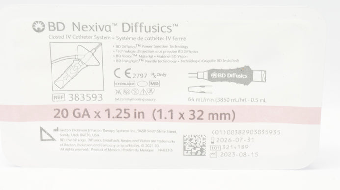 - BD 383593 Nexiva Diffusics Closed IV Cath. System 20GA x 1.25inch 64mL/min