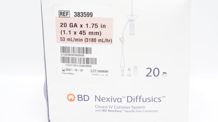 - BD 383599 Nexivia Diffusics Closed IV Cath. System 20Ga x 1.75In. - Box of 20