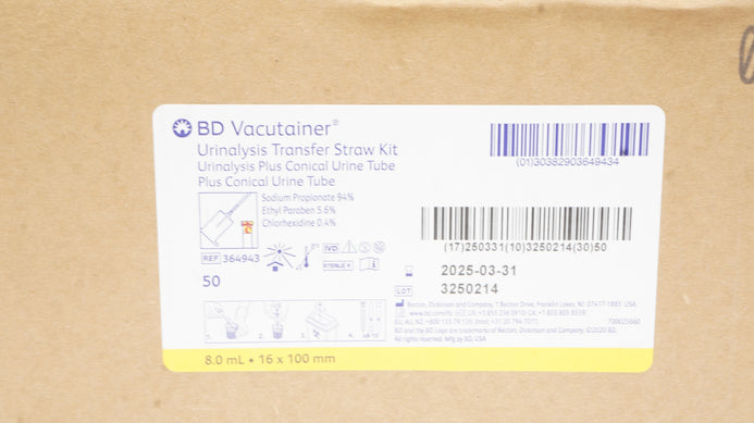 - BD Vacutainer 364943 Urinalysis Transfer Straw Kit 8.0ml, 16 x 100 - Box of 50