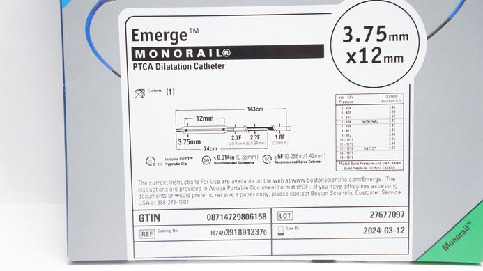 - Boston Scientific H7493918912370 Emerge Monorail PTCA Cath. 3.75mm x 12mm (x)