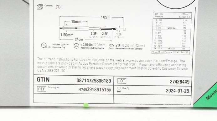 - Boston Scientific H7493918915150 Emerge PTCA Dilatation Cath. 1.50mm x 15mm (x)
