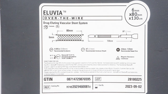 - Boston Scientific H74939294600810 Eluvia Vascular Stnt System 130cm x 6 x 80mm(x)
