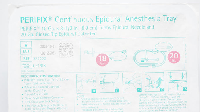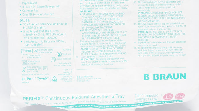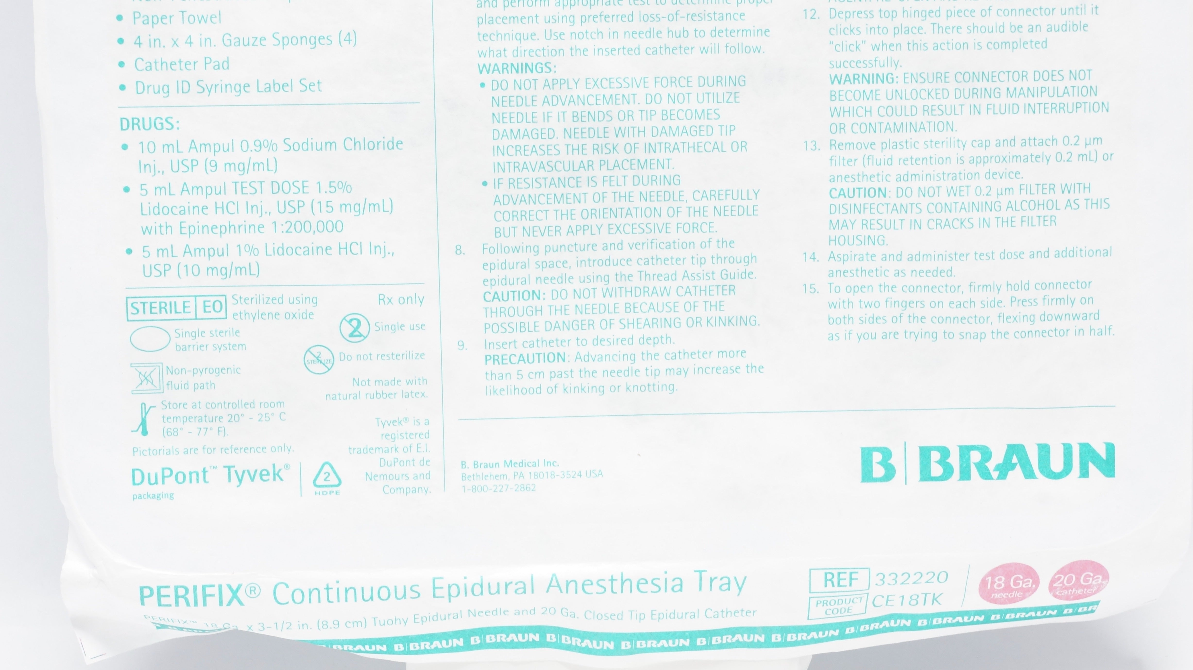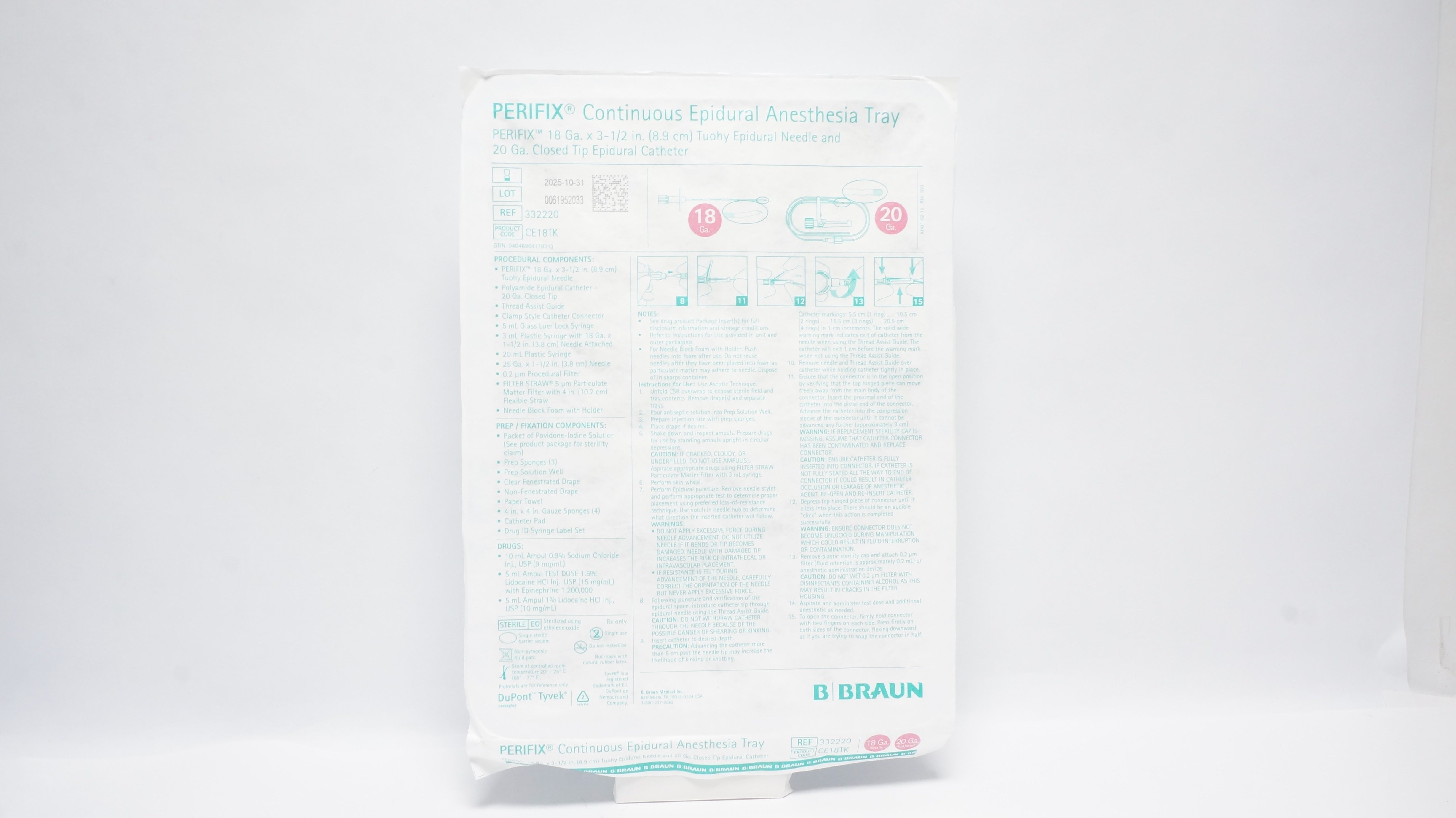 - Braun 332220 Perifix Continuous Epidural Anesthesia Tray 18Ga x 3-1/2In,20Ga (x)