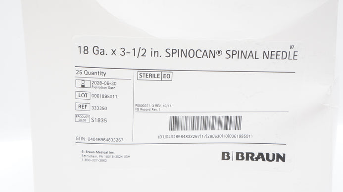 - Braun 333350 Spinocan Spinal Ndle 18Ga x 3-1/2inch - Box of 25