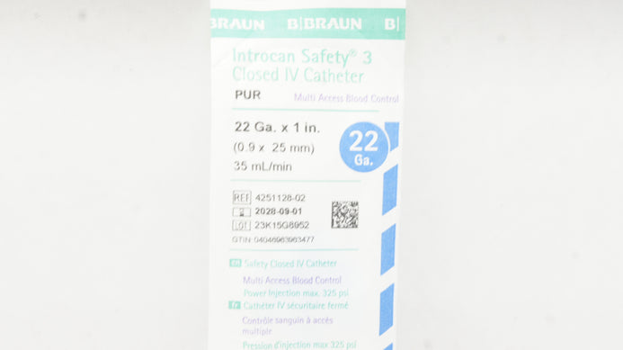 - Braun 4251128-02 Introcan Safety 3 Closed IV Cath. 22G x 1inch x 35ml/min