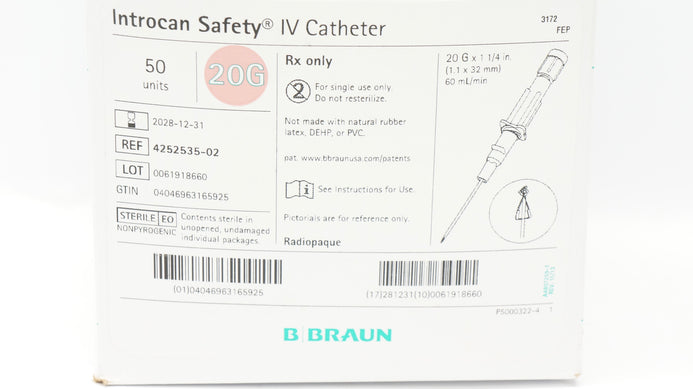 - Braun 4252535-02 Introcan Safety IV Cath. 20G x 1-1/4inch 60mL/min - Box of 50