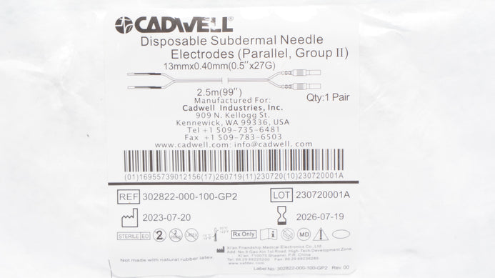 - Cadwell 302822-000-100-GP2 Disposable Subdermal Ndle Electrodes 27G x0.5 x99inch