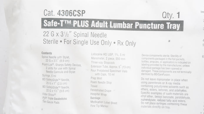- CareFusion 4306CSP Safe-T Plus Adult Lumbar Puncture Tray Ndle 22Gx3-1/2 inch(x)