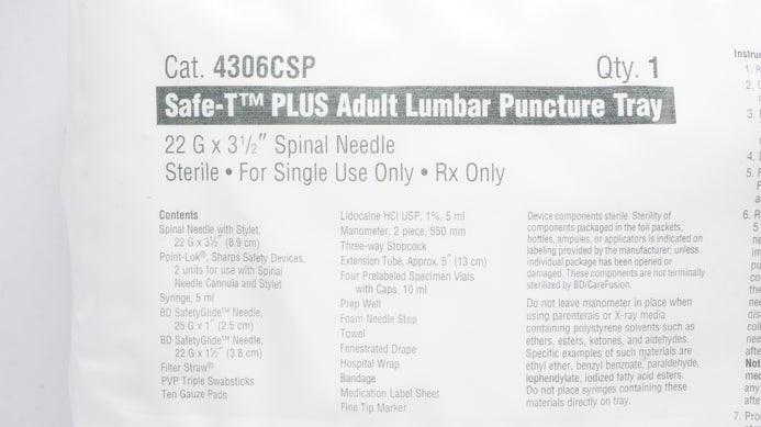 - CareFusion 4306CSP Safe-T Plus Adult Lumbar Puncture Tray Ndle 22Gx3-1/2 inch(x)