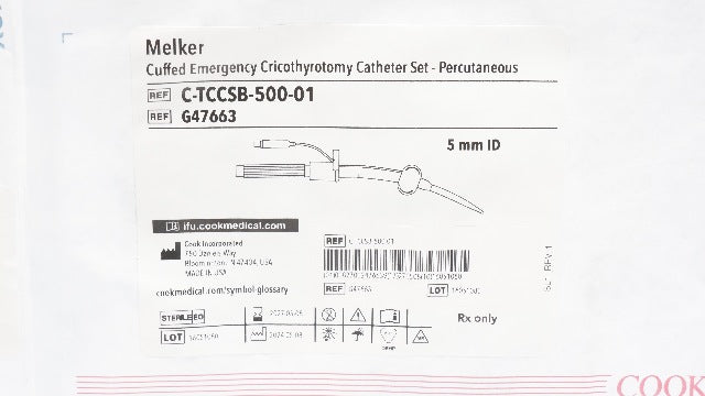 - Cook G47663 Melker Cuffed Emergency Cricothyrotomy Cath. Set, 5mm ID