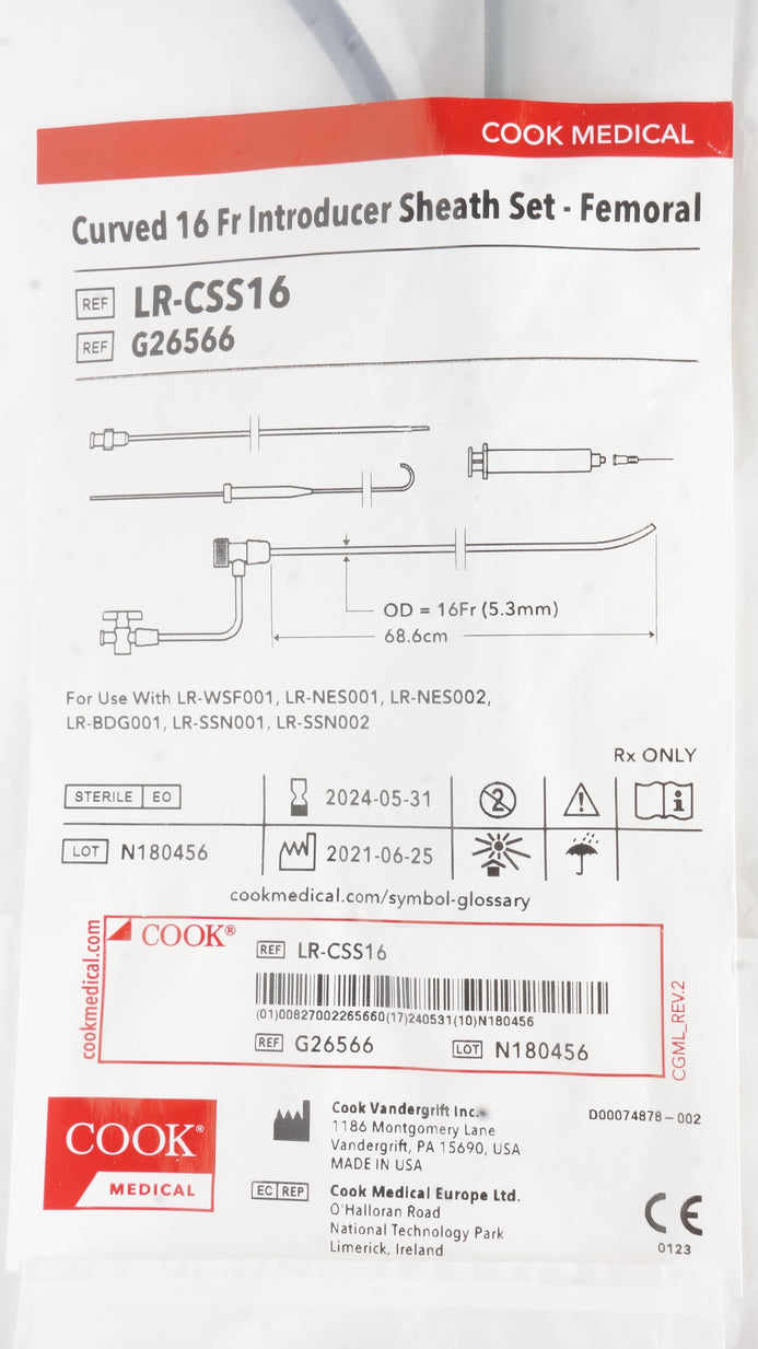 - Cook Medical G26566 Curved Introducer Sheath Set-Femoral 16Fr x 68.6cm (x)