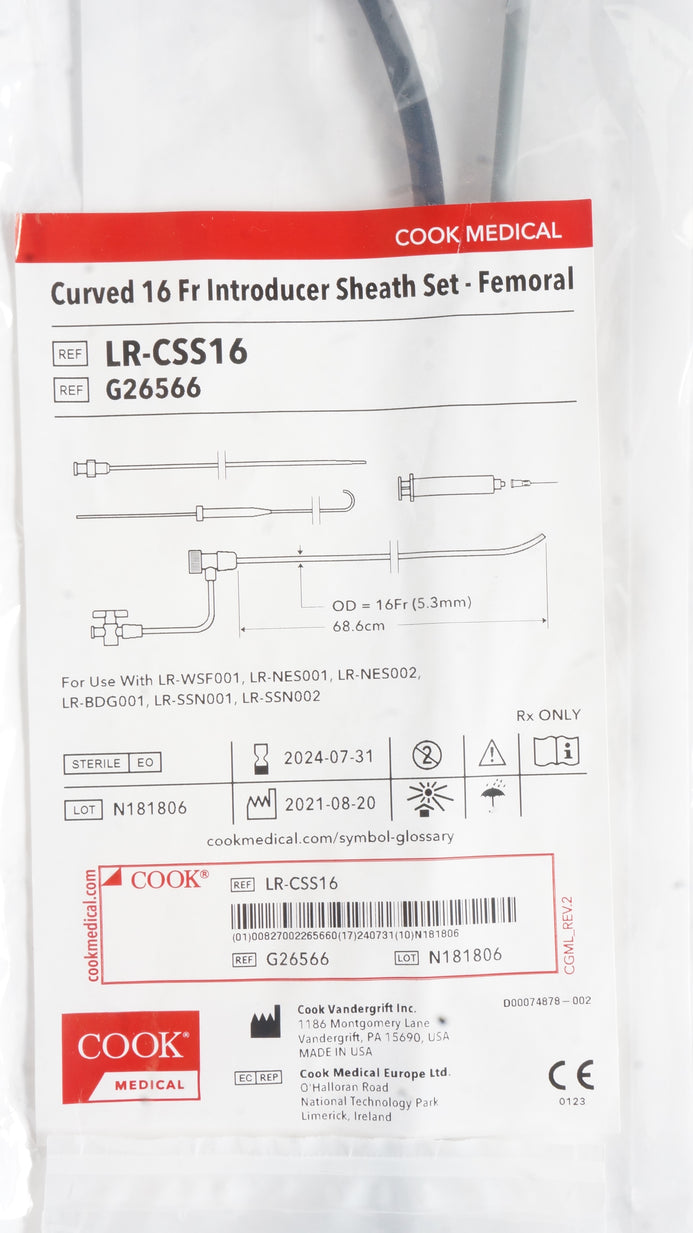 - Cook Medical G26566 Curved Introducer Sheath Set-Femoral 16Fr x 68.6cm (x)