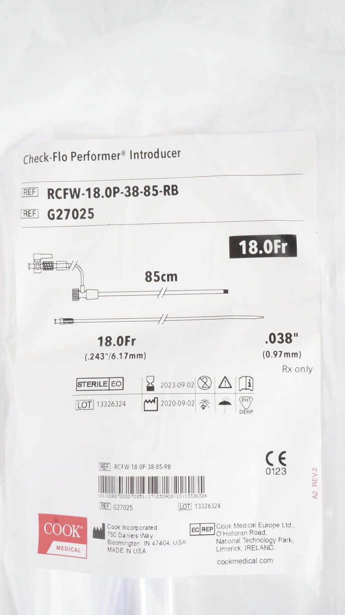 - Cook Medical G27025 Check-Flo Performer Introducer 18.0Fr x .038inch x 85cm (x)