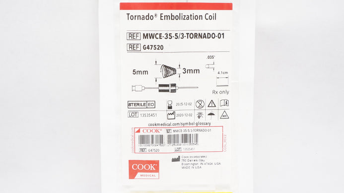 - Cook Medical G47520 Tornado Embolization Coil 5mm x 3mm x 035In x 4.1cm
